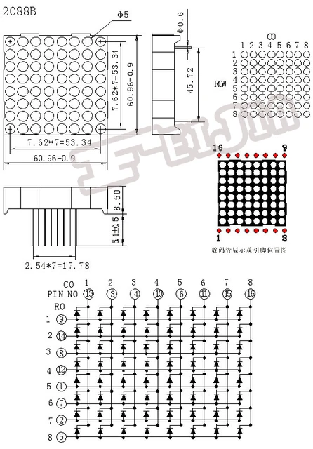 A LED kijelző, pirosan világít és egy 8 * 8 pontból áll. Közös anód a kijelzőbe épített összes 3 mm-es LED számára. Nálunk is szerepel a kínálatban a MAX7219 chiphez csatlakoztatott kijelző vagy MATRIX akár 32 x 8 ponttal.